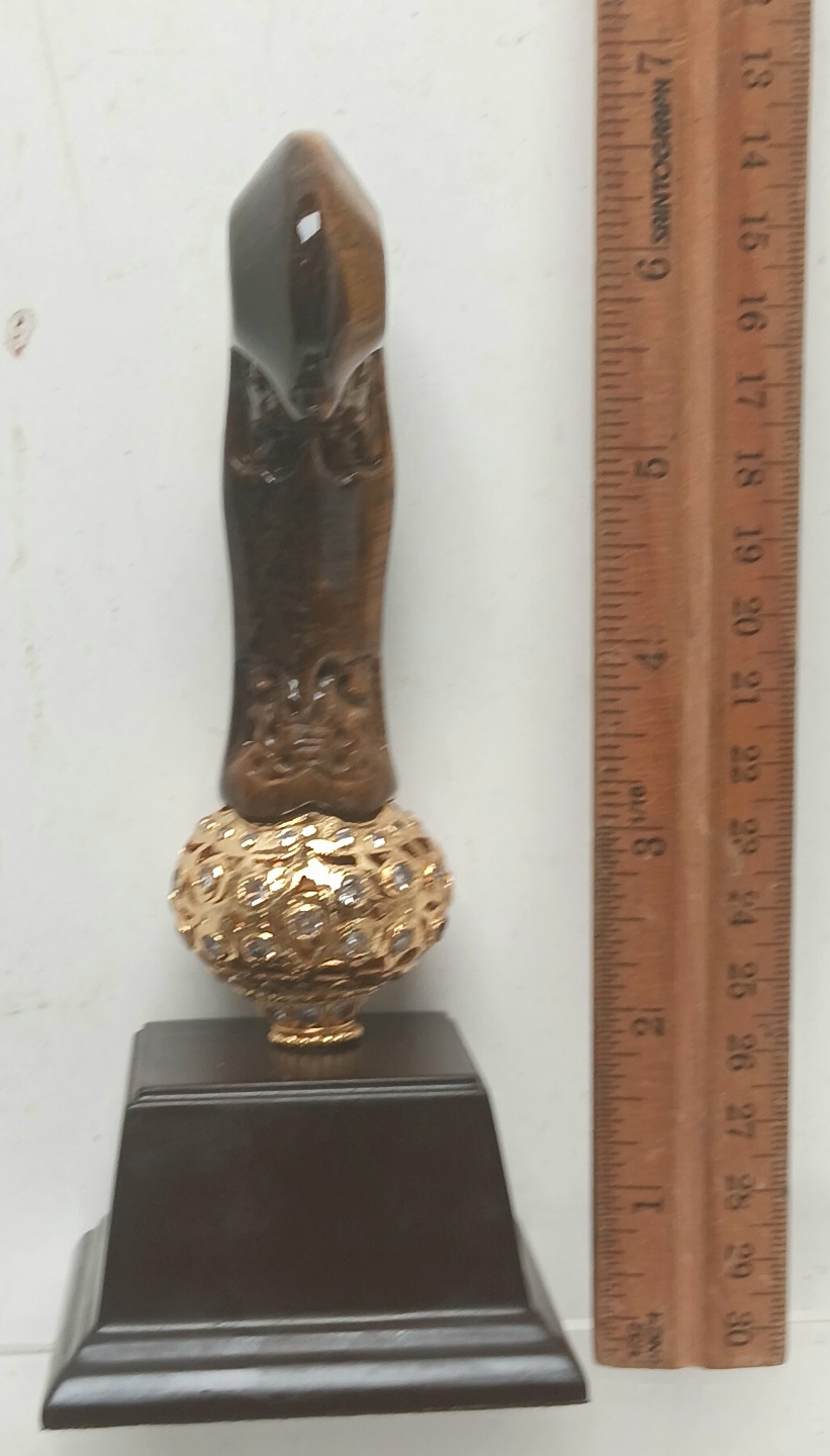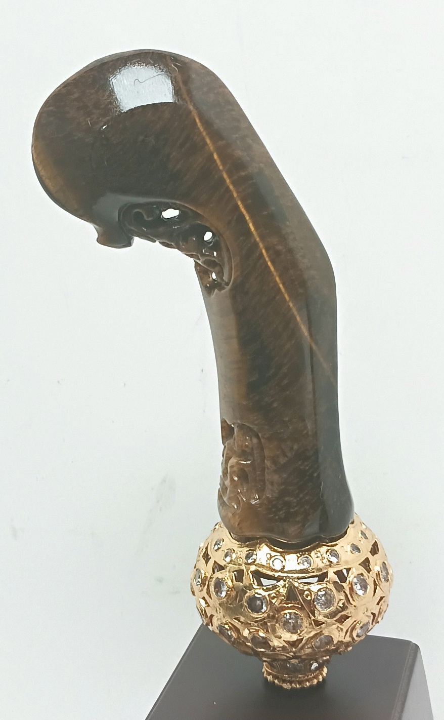 A very rare example of a keris hilt made from tiger’s eye gemstone. In the form called the nunggak semi, and used mainly in central Java, the 7 planner sides has fine carving in the middle called the patras, of which the top has the works pierced through.