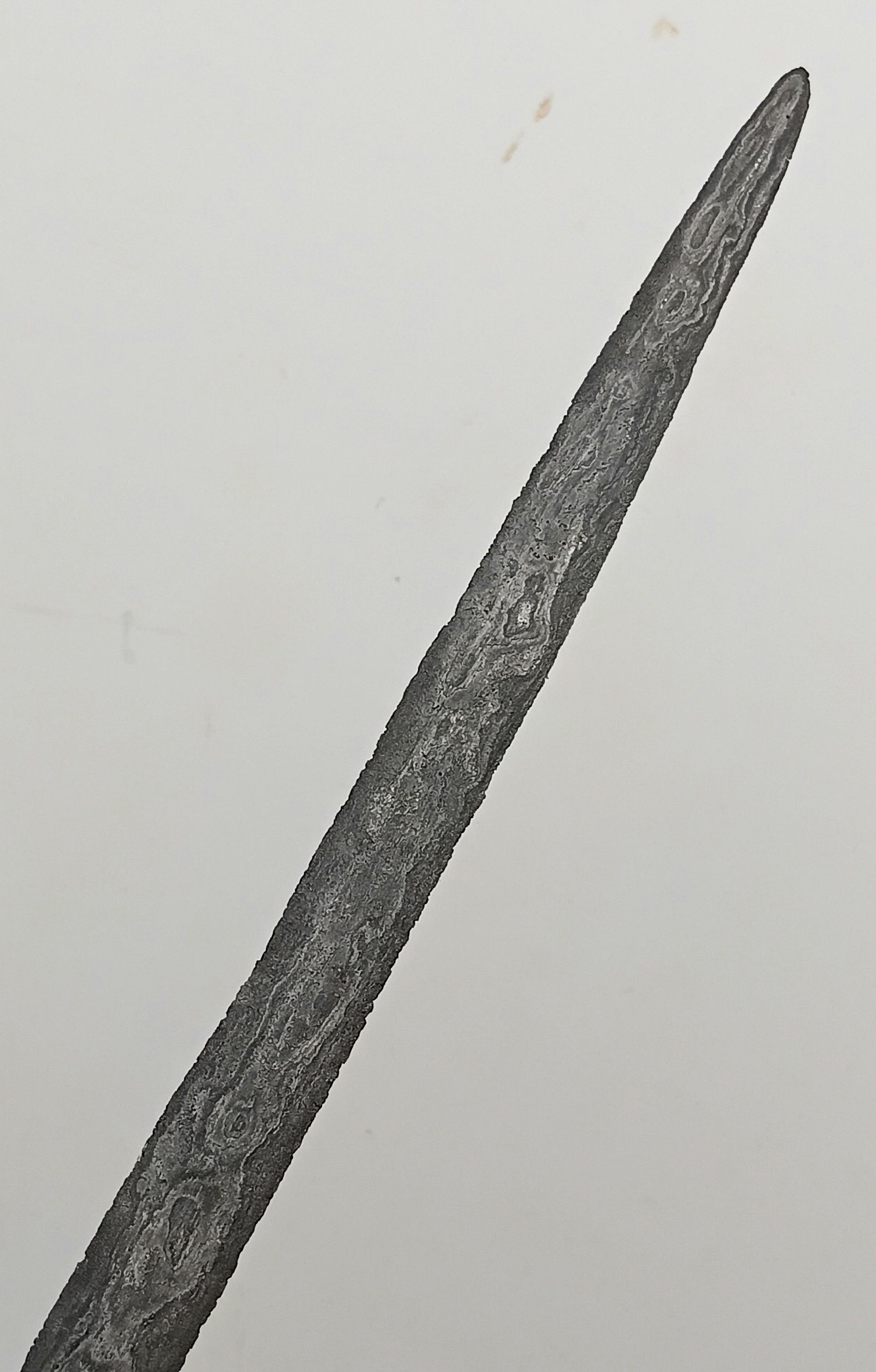 Rare blade with a lurus or straight profile having a symmetrical base feature or perabots using only the aring or pointy ends, without the gandik or blunt side. This rare symmetrical base form is called dapor sepang.