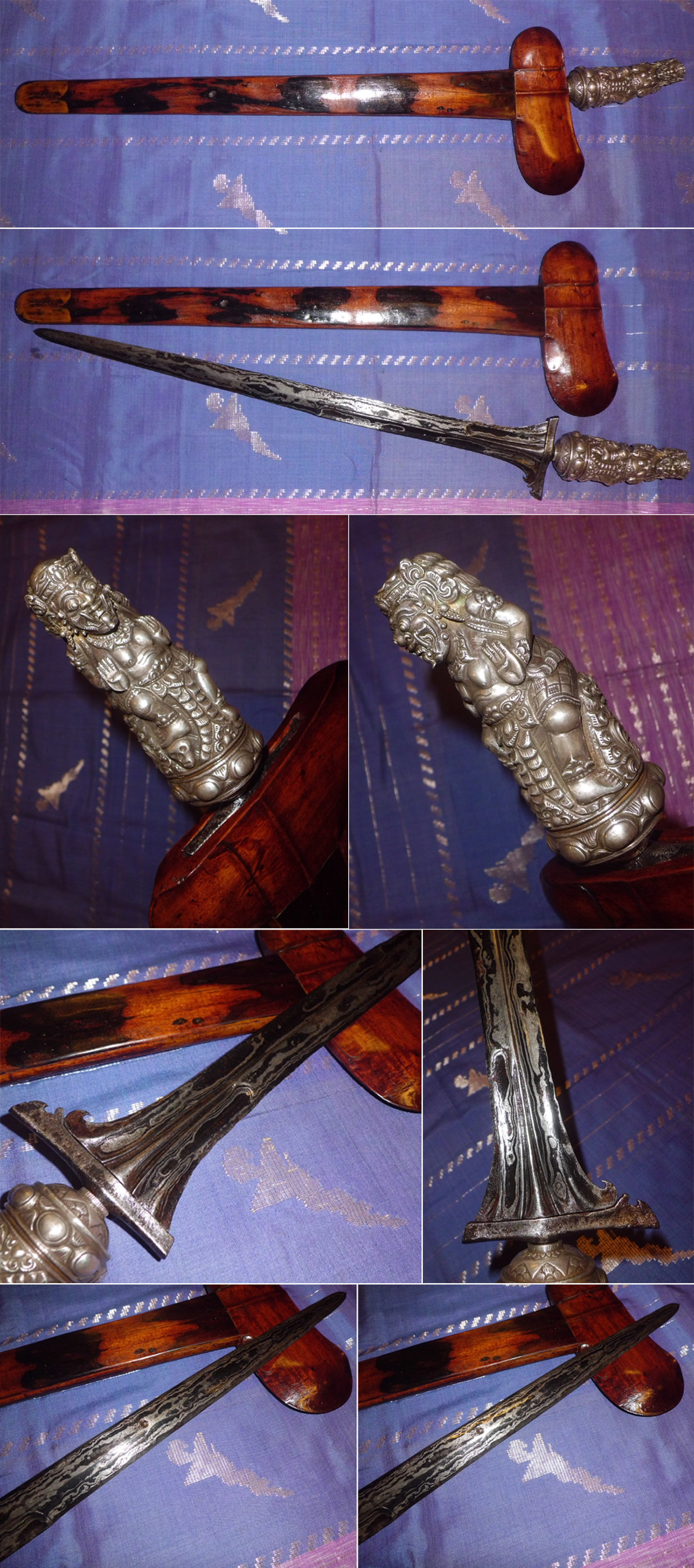 Keris Pedang Bali Lurus Ulu Dewa Perak 0516 -Another rare example of a very long keris from the island of Bali, called the keris pedang or sword keris. Handle is made of silver over wood, and depicts a demonic figurine called ranggda; a female deity that was said to eat babies. The sheath or wrangka in the typical Balinese gayaman form, and is made of well selected pelet woods, with natural contrasting grains that appear due to fungus attack on that particular part of the tree only.