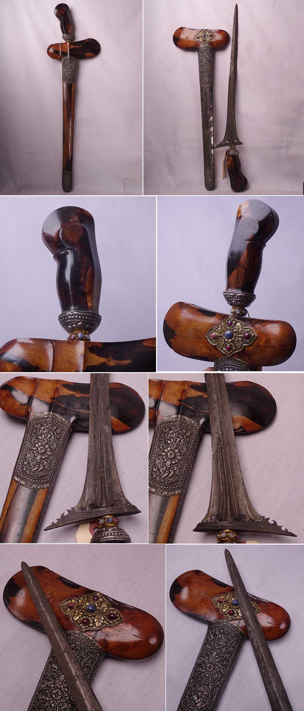 Age: Krises are traditionally made without any date stampings or engravings of the makers' name. Although a kris smith or "empu" has his own styles configured together with the dapor and especially the ganjar (cross piece). Obvious age wear and tear, usage, familiarity with forms, motifs and designs, origin and history, mediums and materials used are our guidelines in determining an approximate age. This particular piece, from our experience and knowledge, should go back to the mid to late 19th century blade and wooden fittings, and mid 20th century silver works.