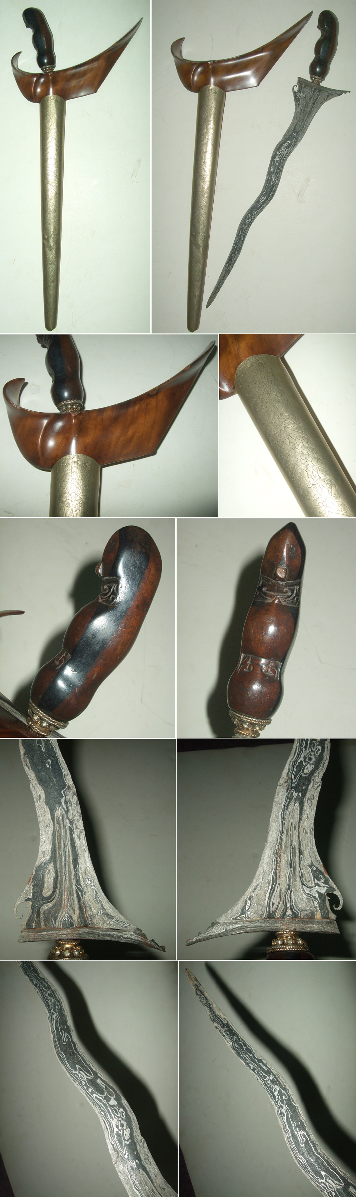 Age: Krises are traditionally made without any date stampings or engravings of the makers' name. Although a kris smith or "empu" has his own styles configured together with the dapor and especially the ganjar (cross piece). Obvious age wear and tear, usage, familiarity with forms, motifs and designs, origin and history, mediums and materials used are our guidelines in determining an approximate age. This particular piece, from our experience and knowledge, should go back to the early 19th century.