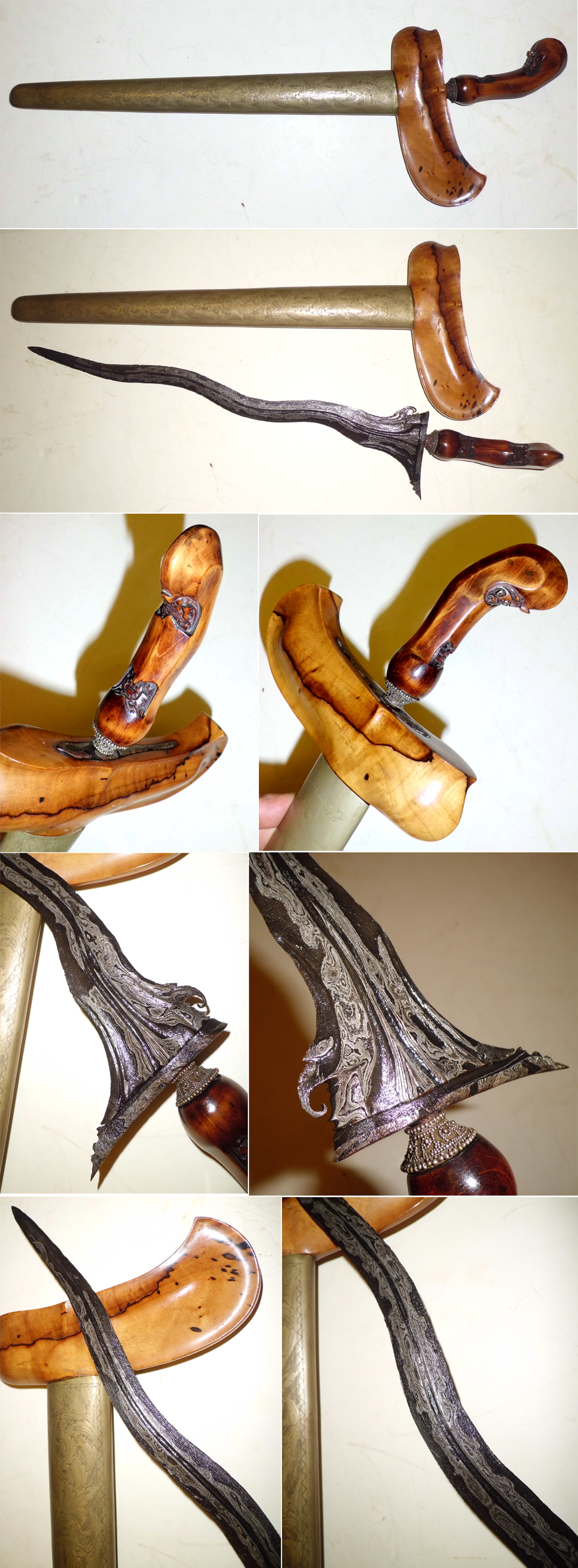 Age: Krises are traditionally made without any date stampings or engravings of the makers' name. Although a kris smith or "empu" has his own styles configured together with the dapor and especially the ganjar (cross piece). Obvious age wear and tear, usage, familiarity with forms, motifs and designs, origin and history, mediums and materials used are our guidelines in determining an approximate age. This particular piece, from our experience and knowledge, should go back to the early 19th century.