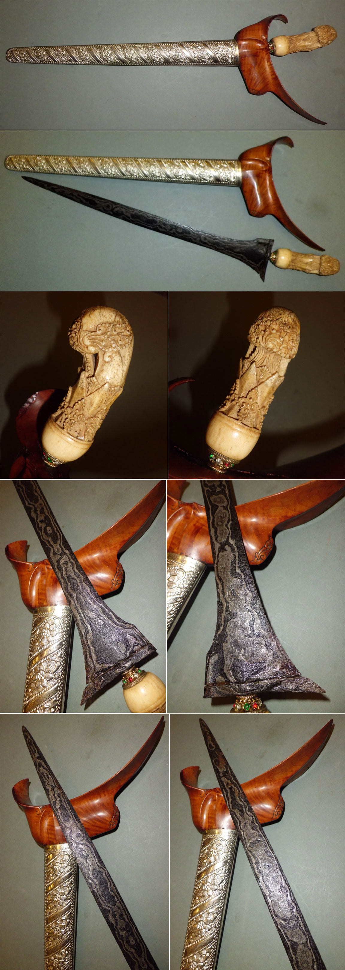 Age: Krises are traditionally made without any date stampings or engravings of the makers' name. Although a kris smith or "empu" has his own styles configured together with the dapor and especially the ganjar (cross piece). Obvious age wear and tear, usage, familiarity with forms, motifs and designs, origin and history, mediums and materials used are our guidelines in determining an approximate age. This particular piece, from our experience and knowledge, should go back to the early 19th century, with 20th century silver alloy stem cover.