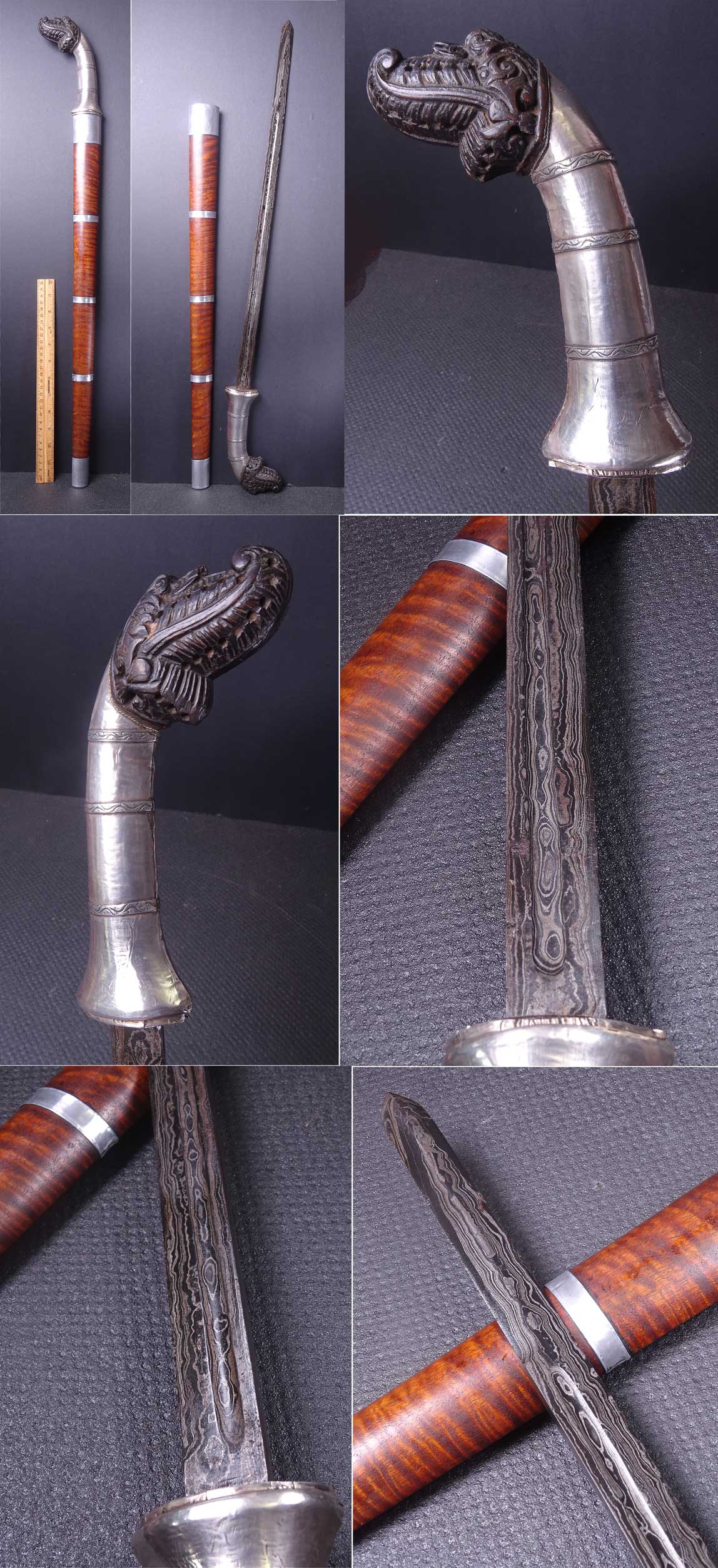 Klewang Tusuk Lombok Kulit Semangko 0820 - Another rare example of a long stabbing sword called the klewang tusuk from the island of Lombok. Typical handle form, is a floral representation of the Garuda mungkur, is made from buffalo horn and is encased at the grip and base with plain silver. The wooden sheath is made from well selected flashing grained woods, having plain silver alloy, or alpaka, bands and bottom tip.